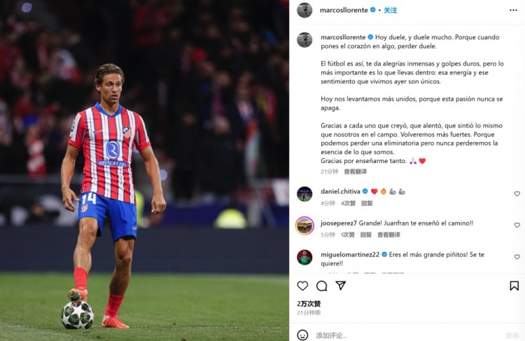 3月14日讯 马竞在本轮欧冠主场被皇马点球淘汰,出自皇马青训的马科斯-略伦特罚丢点球,他也在今日通过社媒发文。