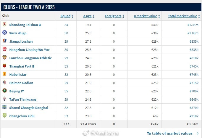 2025-03-14 11:53:06中乙球队身价更新:山东泰山B队以135万欧元排在第一
