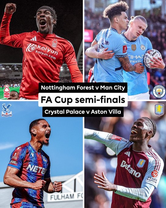 足总杯4强对阵出炉:曼城vs诺丁汉森林,水晶宫vs维拉